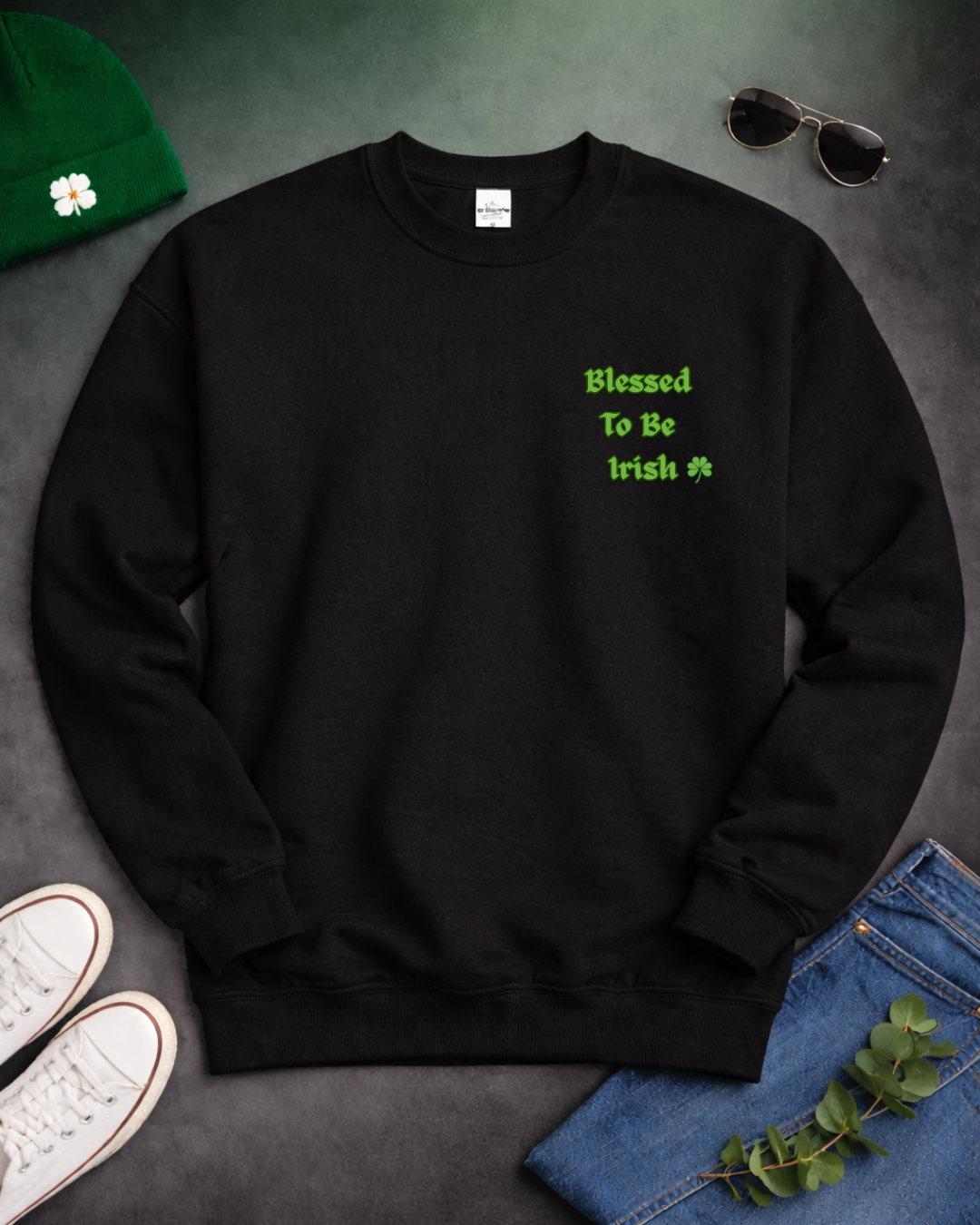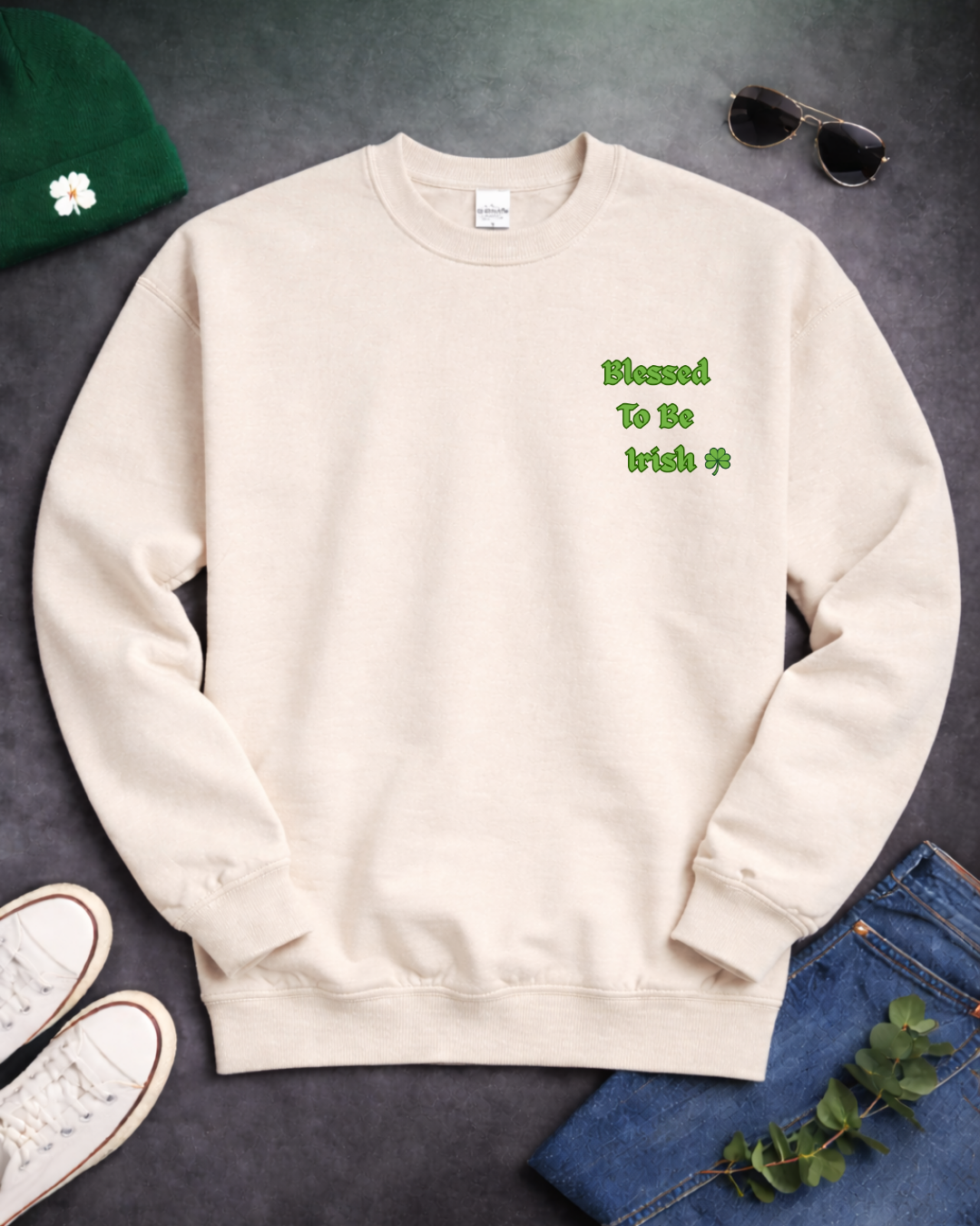 Blessed To Be Irish Embroidered Crewneck Sweatshirt – St Patrick’s Day Shamrock Pullover – Gildan 18000 Unisex