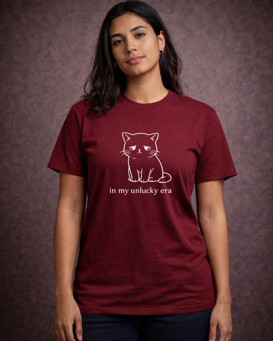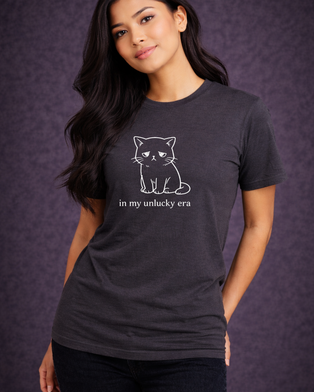 If life feels a little cursed lately, this “In My Unlucky Era” sad cat tee says it for you—no explanation needed.