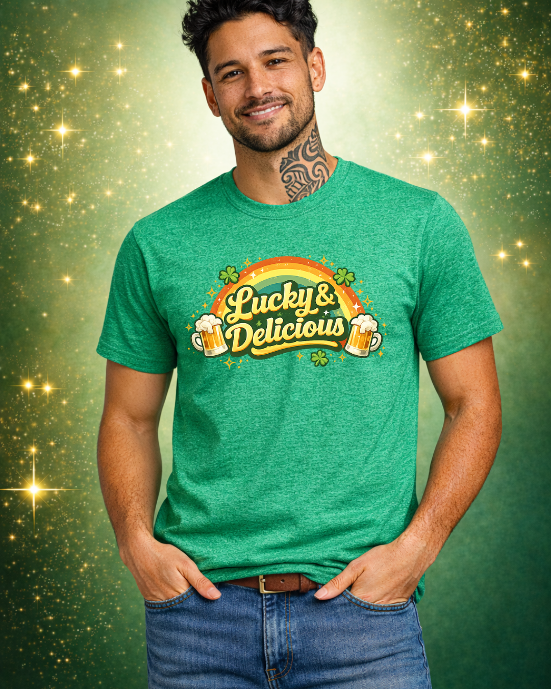 Lucky and Delicious St. Patrick’s Day Shirt – Funny Beer Lover Graphic Tee – Rainbow Shamrock Unisex T-Shirt