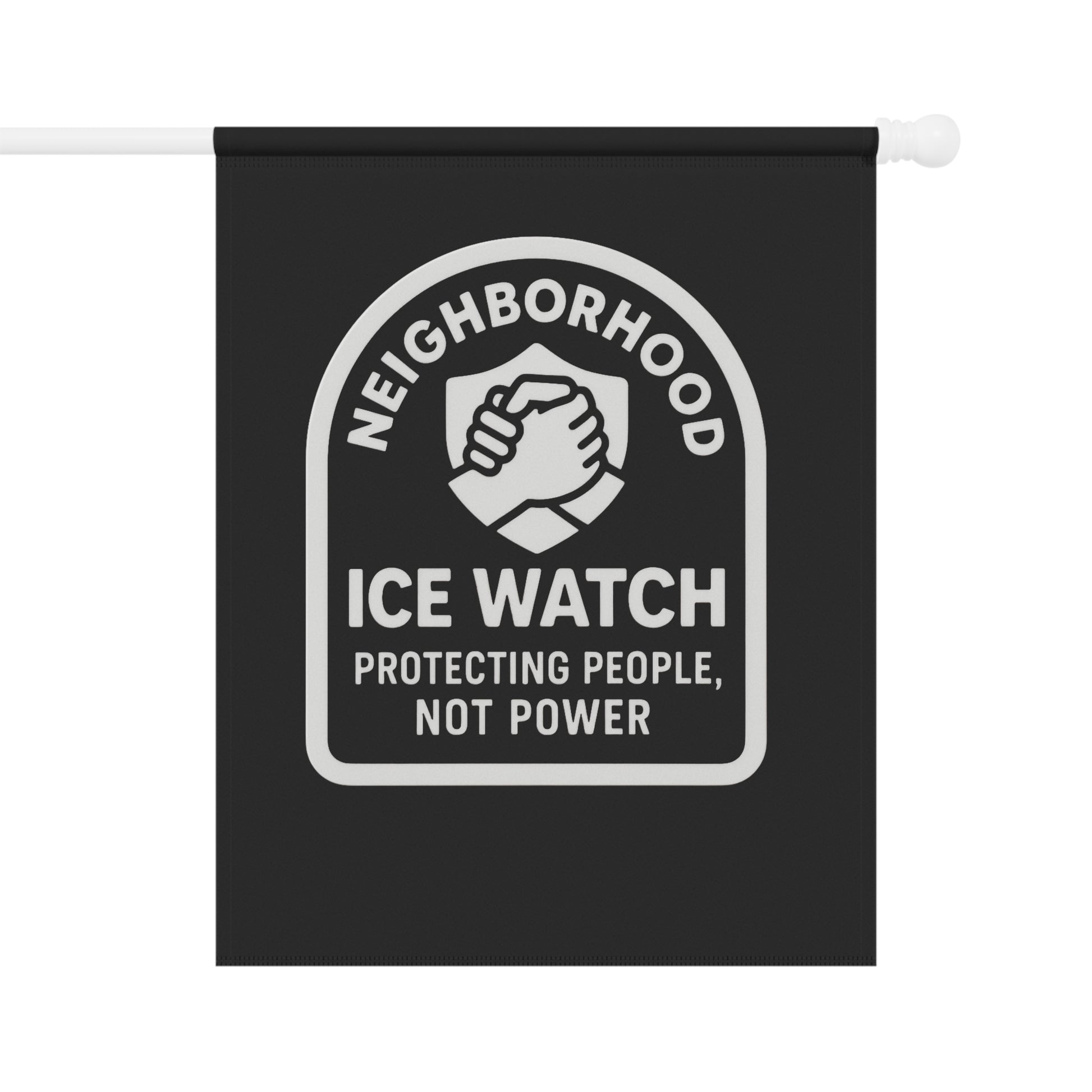This bold Neighborhood ICE Watch flag features a clean badge-style design with the message: “Protecting People, Not Power.” Designed for allies, organizers, and communities who want their values visible from the street.