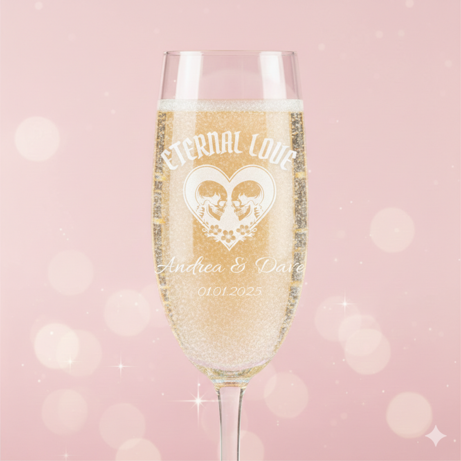 Personalized Gothic Champagne Glass – Eternal Love Engraved Flute with Custom Names & Date