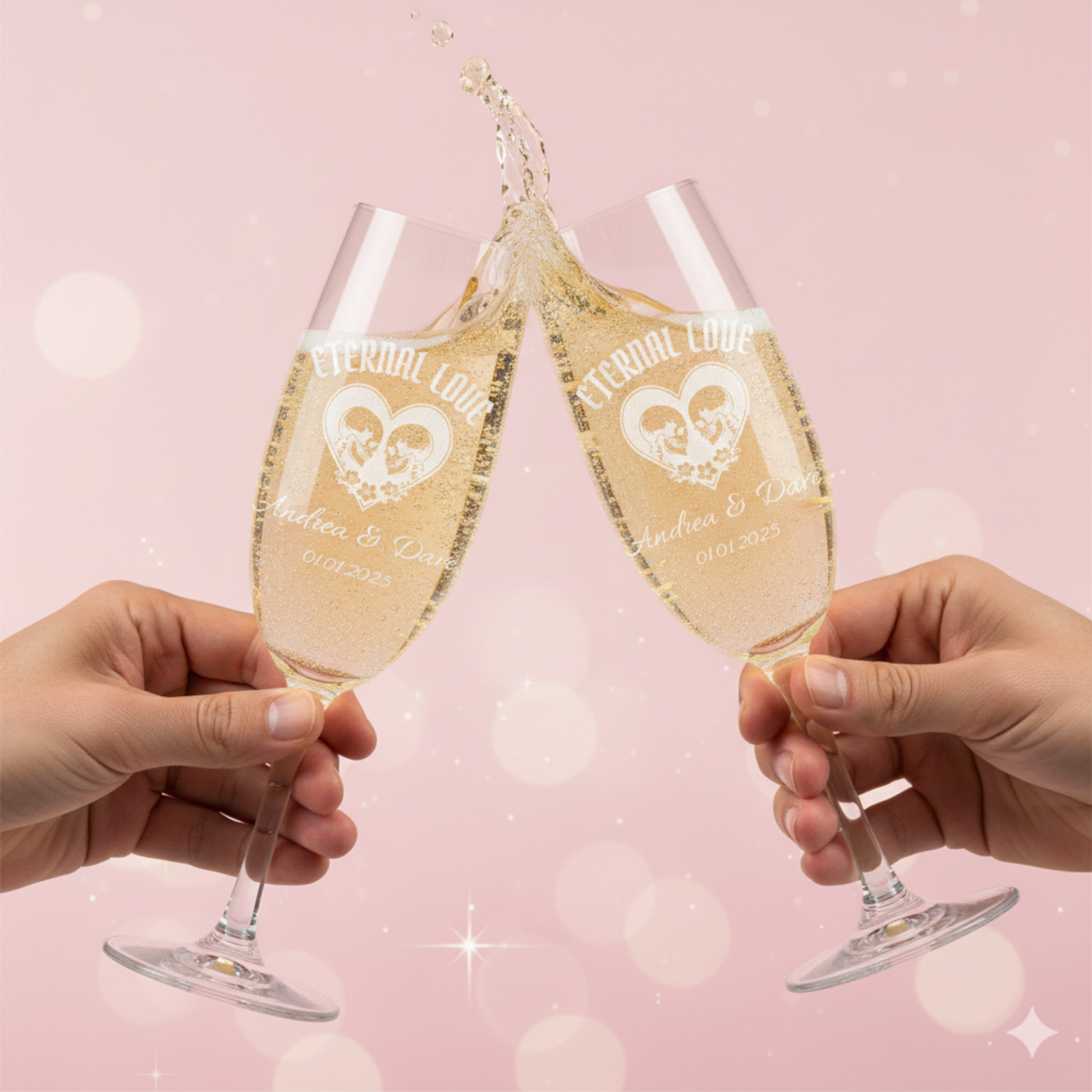 This single engraved champagne flute is customized with your chosen names and date, creating a meaningful keepsake for anniversaries, Valentine’s Day, engagements, weddings, or alternative romantic gifts. The design is etched directly into the glass, not printed or vinyl, ensuring a timeless finish that will never fade, peel, or wash away.